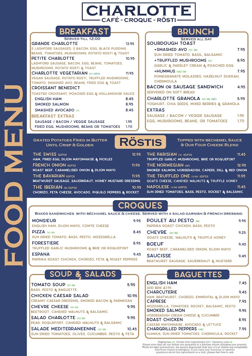 The menu at Charlotte offers a variety of options suitable for breakfast, brunch, and light meals throughout the day. It is organized into several distinct groups that cater to different preferences and dietary needs.