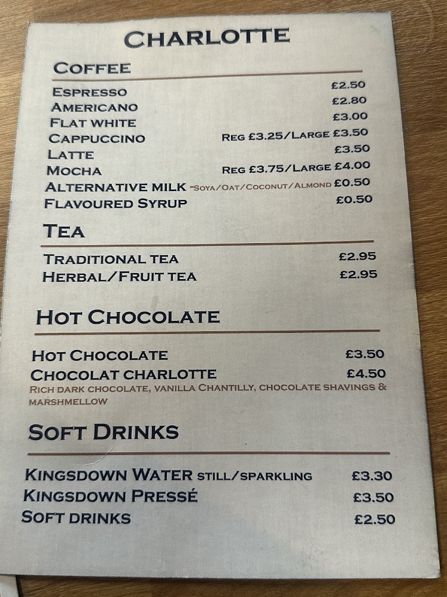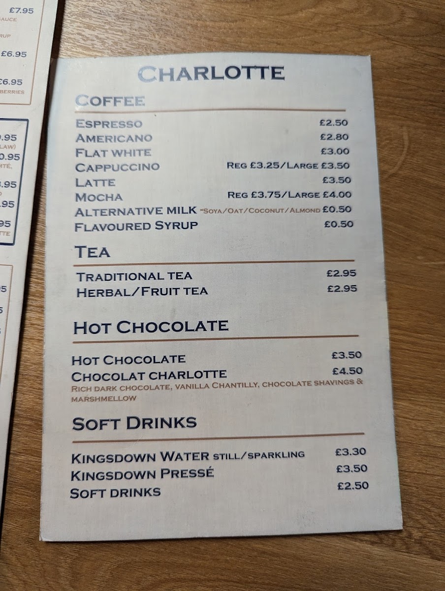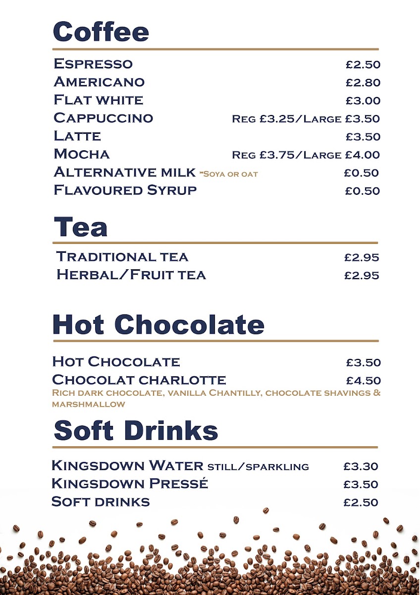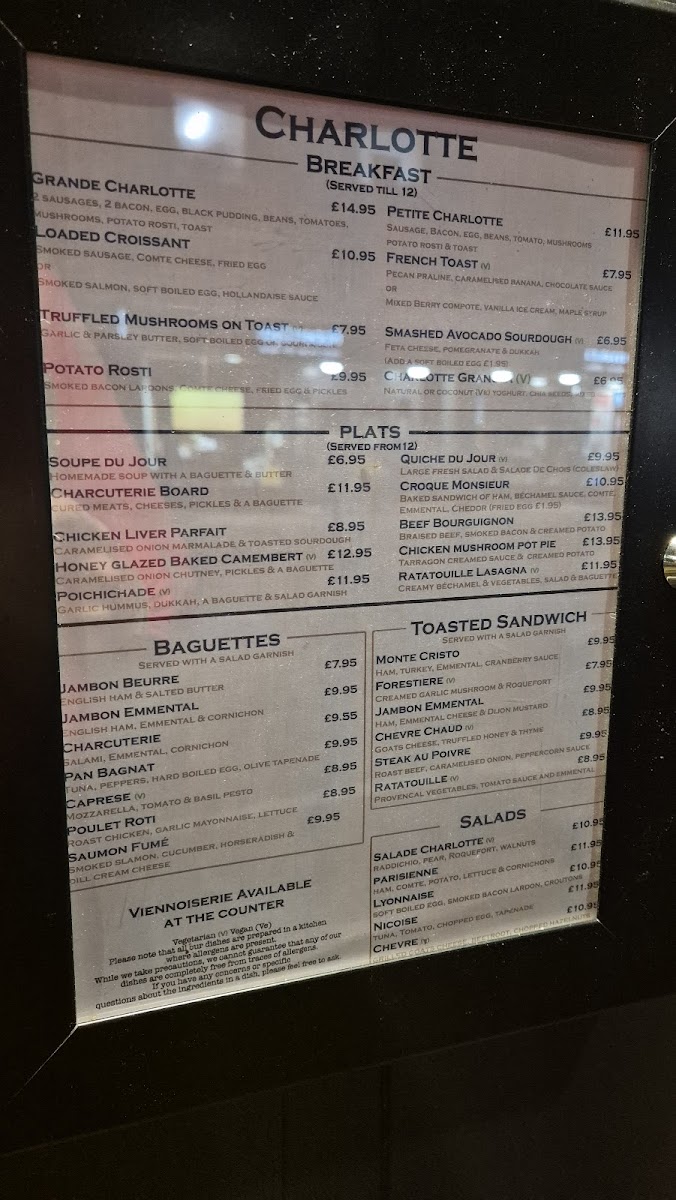 Baguettes on the menu include a selection of fillings such as English ham with an option to add brie, charcuterie meats combined with cheese, caprese style with mozzarella and tomato, smoked salmon with cream cheese, roast chicken with avocado, chevre cheese, and chargrilled peppers for a vegan alternative.